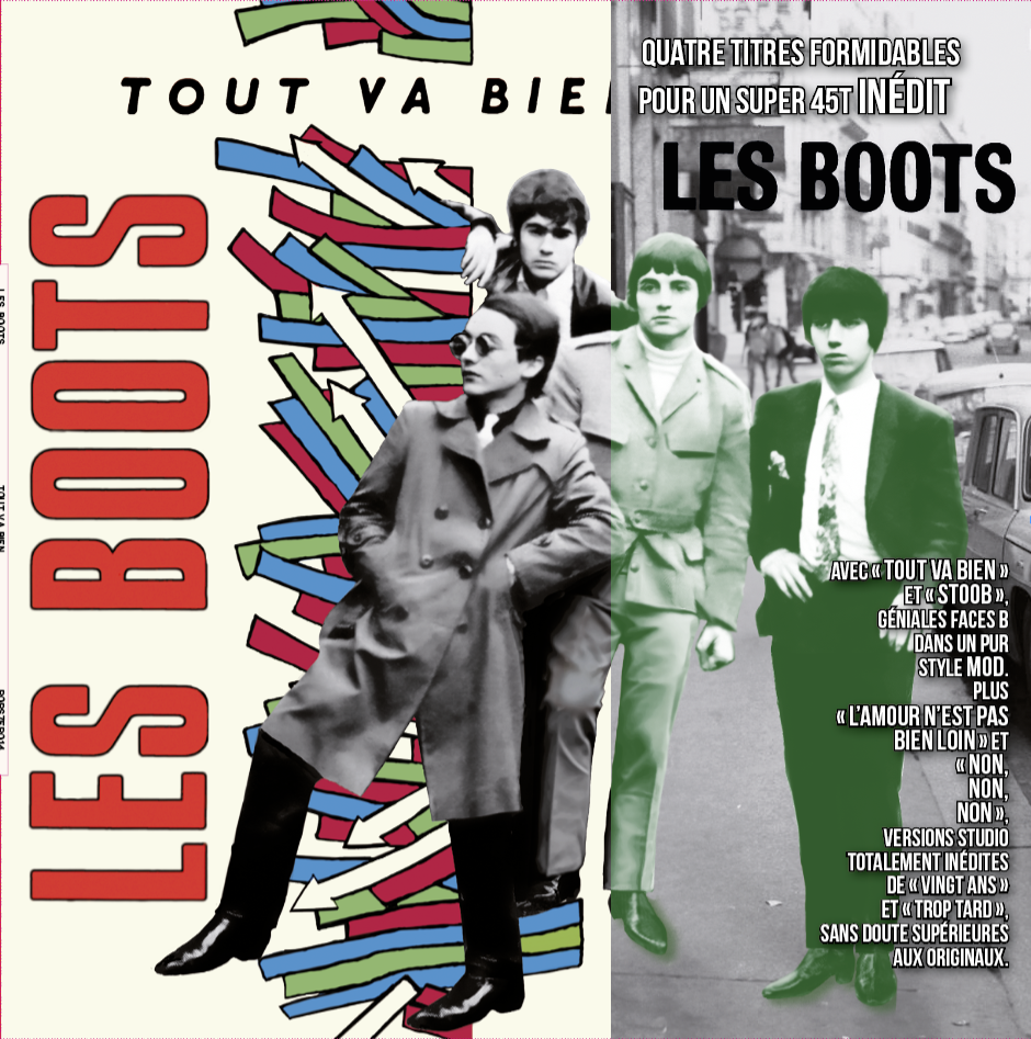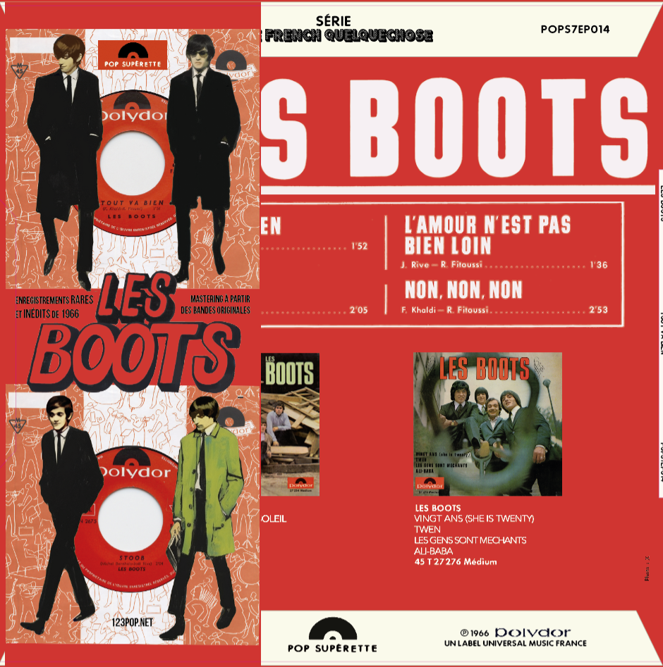 Les BOOTS ont représenté en France, avec Ronnie BIRD, Les PROBLÈMES et quelques autres groupes, la crème du rock anti-yéyé. Tous ont créé quelque chose d’unique, une véritable pop culture à la française, qui tient à la fois des minets du Drugstore ou des rockers de chez Castel, de l’existentialisme façon nouvelle vague, des beatniks du Quartier latin, des Pieds Nickelés et, bien sûr, du Swingin’ London et de son British Beat. Dans ce super 45 tours des BOOTS, on y entend quatre mod-rockers qui connaissent leur jerk sur le bout des doigts. Ils ont un son aiguisé et saturé à souhait, des harmonies impeccables, du niveau de celles des Hollies, pas moins que ça… Et surtout des mélodies irrésistibles chantées en français ! Accompagné de deux guitaristes aux idées percutantes, Joël Rive et Farid Khaldi (futur Denis Pépin), le bassiste, Robert Fitoussi (futur F.R. David), se révèle être un formidable chanteur, avec un phrasé aigu très particulier, donnant la sensation que sa voix et les harmonies du groupe fendent l’air ou y glissent dessus. Un must !